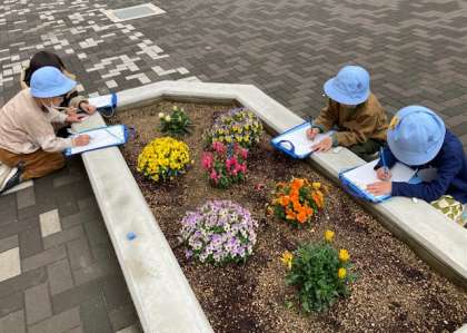 2年生が生活科「校庭で春をさがそう」を学習しています。雨がやんだので、花の広場に咲いている花を観察カードに書きました。ヒナギク、パンジー、ハナミズキなどスケッチしました。