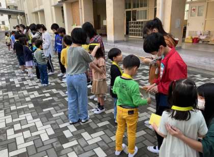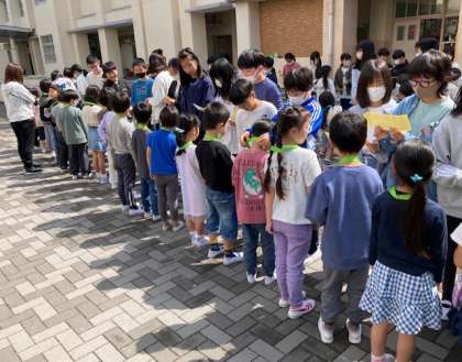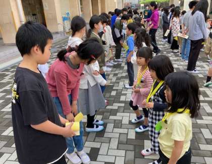 児童会の主催で、1年生の入学をお祝いする会を行いました。1年生が講堂に入場する前に、花の広場で6年生からメダルをもらいました。1年生は名前の書いたカードを6年生に渡し、自己紹介をしました。