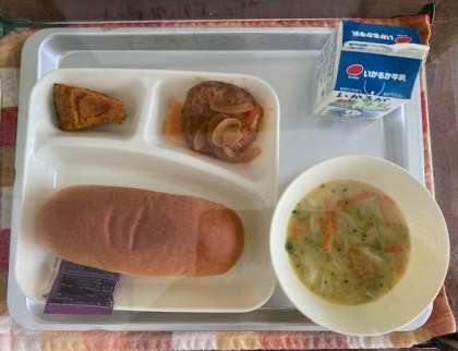 献立は、煮込みハンバーグ、コーンとキャベツのスープ、焼きかぼちゃ、コッペパン、ブルーベリージャム、牛乳です。