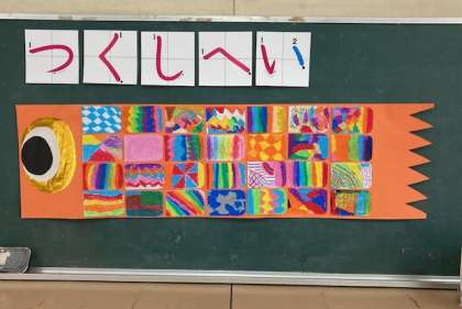 1年生がこいのぼりを作っています。色々な色や模様を考えて、うろこを作りました。のりでしっかりとうろこを貼り付けて完成です。