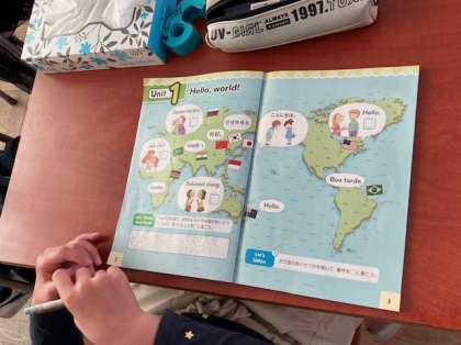 担任の先生と外国語活動「Helloworld」をしました。世界の色々な国のあいさつについて学習しました。