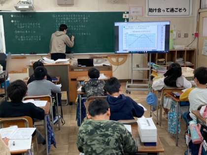 4年生が算数で折れ線グラフを学習しています。折れ線グラフの縦軸、横軸が何を表しているかを考えました。また、折れ線グラフを重ねるとちがいがわかりやすいことを学びました。