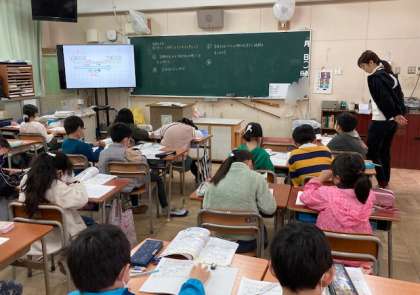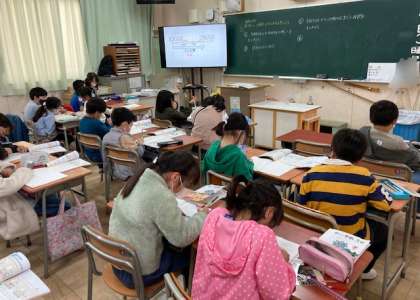 3年生が算数「時こくと時間のもとめ方」を学習しています。時間の流れを図で表すとわかりやすいです。
