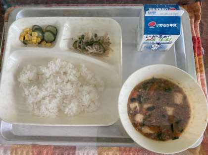 献立は、マーボーどうふ、きゅうりとコーンの甘酢あえ、もやしとピーマンのごまいため、ご飯、牛乳です。
