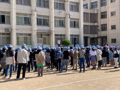 五月晴れのもと、運動場で児童朝会をしました。今月の27日(土)は運動会です。今日から運動会の練習が始まります。校長先生からは、「一致団結」して運動会の練習をがんばりましょうとお話がありました。