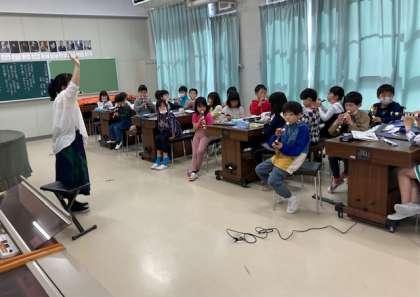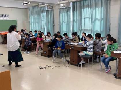 音楽担当の先生からリコーダーの使い方を教えてもらいました。3年生からリコーダーを使います。吹き方、指の押さえ方などの基本を学びました。