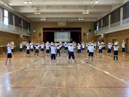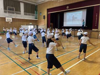 4年生が体育館で運動会の団体演技「エイサー」を練習しました。パーランクを持って練習しました。体育館でバチを使ってパーランクをたたくと、とても響くので手でたたきました。