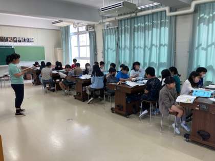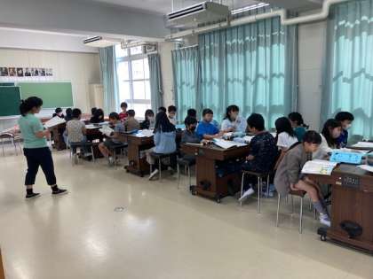 4年生が音楽室で「歌のにじ」を歌いました。この曲では、リコーダーと合わせて、明るい声で歌うことがめあてです。なかなか明るい弾むような歌声でした。