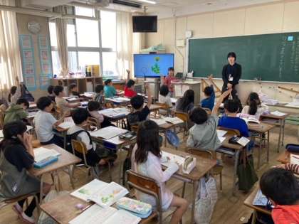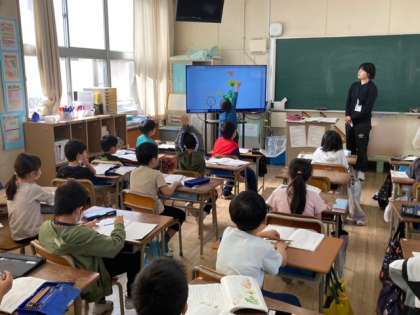 2年生が国語で、「たんぽぽのひみつを見つけよう」をめあてとして、段落に書かれている内容を読み取りました。大型テレビに映し出された、たんぽぽの写真を使って説明しました。