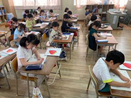 1年生が国語「あめですよ」を学習しています。音読してワークシートに取り組みました。読む時も書く時も正しい姿勢でできるように取り組んでいます。