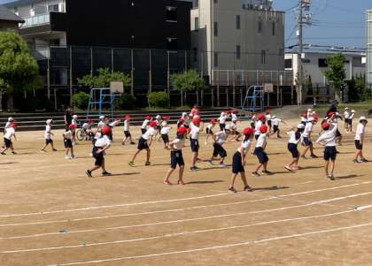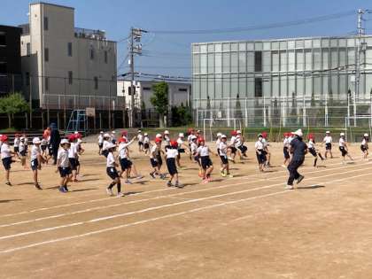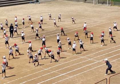 運動場で3年生が運動会の団体演技の練習をしました。アニメの曲に合わせて元気よく楽しく踊っています。