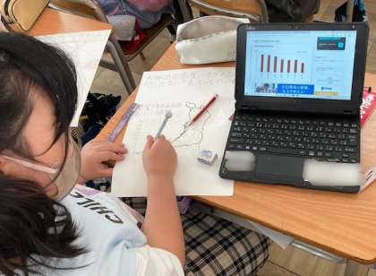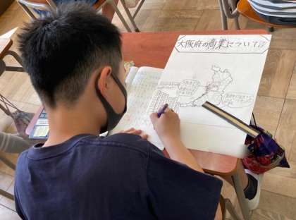4年生が社会科で大阪府についての新聞を作成しています。タブレット端末を使って大阪府の商業、漁業、農業、住みよいまちなどを調べてまとめています。