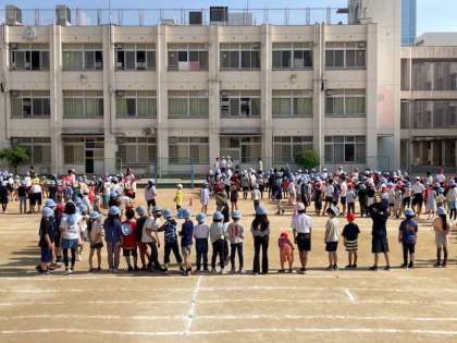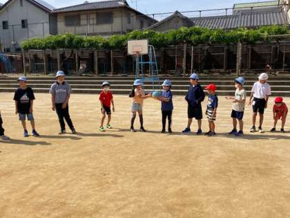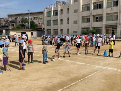 スマイル班(たてわり班)で運動場に集まって、集会をしました。集会委員会が考えたゲームをしました。6年生がリーダーとして活躍しました。