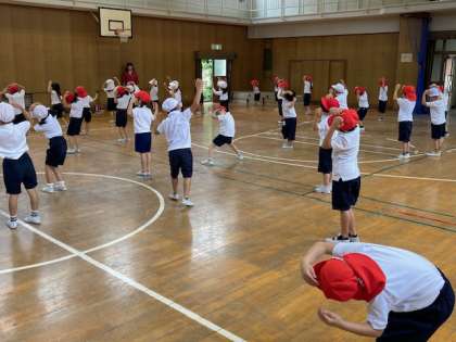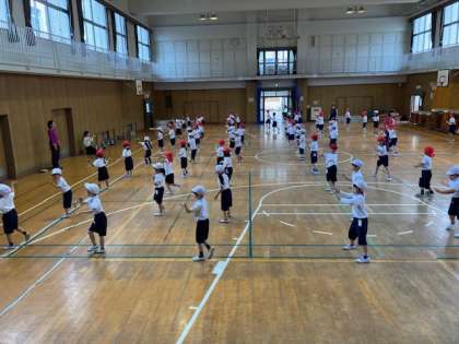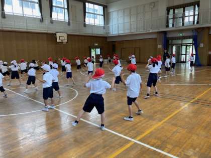今日は雨なので、体育館で団体演技の練習をしました。新しい隊形を覚え、楽しく踊ることができました。