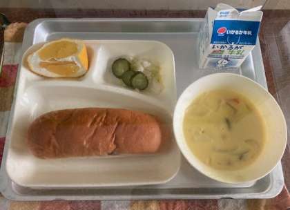 献立は、コーンクリームシチュー、キャベツときゅうりのサラダ、かわちばんかん、レーズンパン、牛乳です。