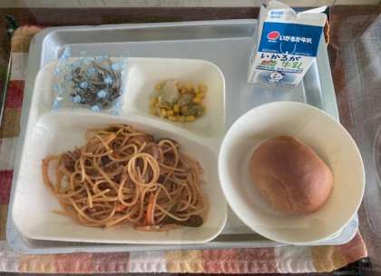 献立は、ミートソーススパゲッティ、レタスとコーンのサラダ、ミニフィッシュ、ミニ黒糖パン、牛乳です。