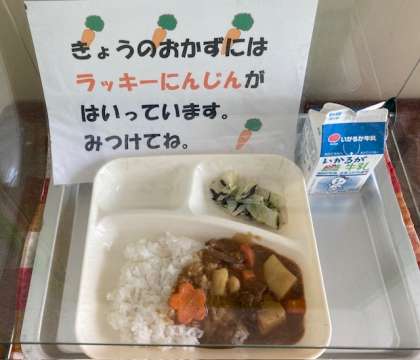 献立は、牛肉と大豆のカレーライス、キャベツのひじきドレッシング、ヨーグルト、牛乳です。