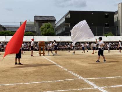 紅白対抗の応援合戦をしました。応援団長を中心に、元気に応援合戦ができました。