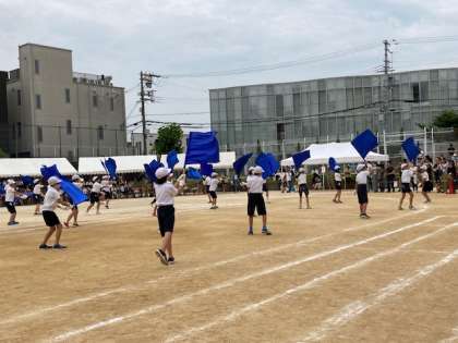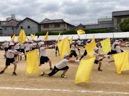 6年生の団体演技は、「一致団結〜VICTORY〜」です。音楽に合わせて、青と黄色のフラッグを振り、6年生の一致団結の姿を表現しました。途中、フラッグを置き、組体操の1人技をしました。見事な演技に、感動です。