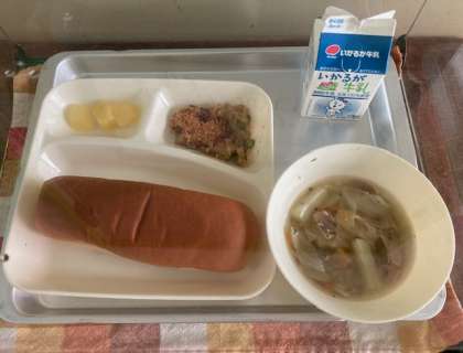 献立は、カレードリア、豚肉とキャベツのスープ、りんごの缶詰、黒糖パン、牛乳です。