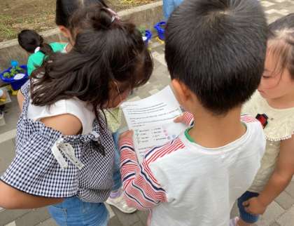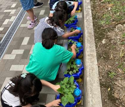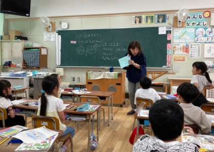 1年生は、あさがおを育て観察をしています。今日はふたばをよく見て、観察カードを書いていました。すると、あさがお王国のあさがお姫からお手紙が届きました。毎日の水やりのお礼と、あさがおの秘密を教えてもらいました。その秘密とは、茎の色が紫なら紫や赤色の花、ほとんど緑なら白い花、薄い赤色ならピンク色の花であると。子どもたちは早速、茎の色を調べに行き、「私のあさがおは紫の花になる」と、歓声をあげていました。