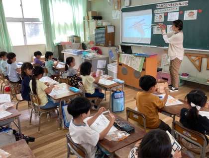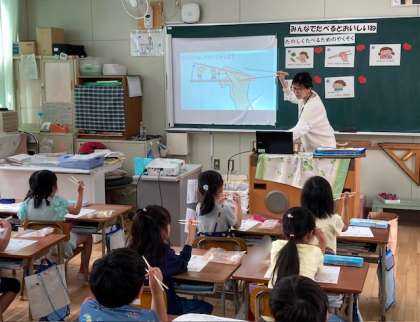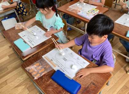 1年生が区内の栄養教諭に来ていただき、食育指導をしてもらいました。各学級で年間2回実施します。今日は、お箸の持ち方を教えてもらいました。正しくお箸が使えるように、お家でも練習してください。