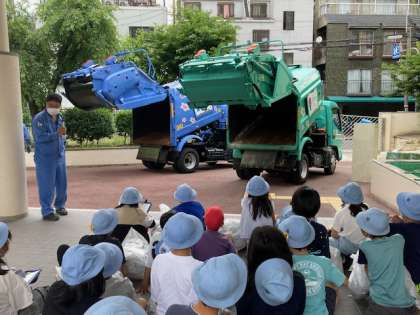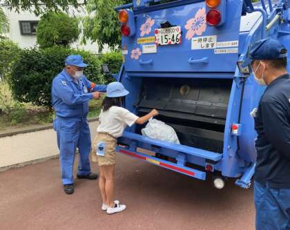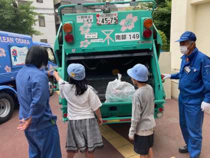 4年生が社会「住みよいくらしとごみ」の学習をしています。今日はパッカー車が学校に来ました。環境事業局の職員の方からパッカー車の説明をしてもらい、ごみ収集を体験しました。