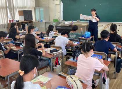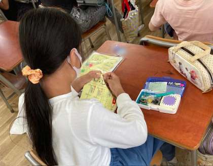 家庭科は、まつり縫いをしました。練習布に針を入れる順番が書いてありますので、それに従って縫っていきました。