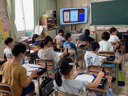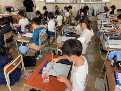 3年生が毛筆の学習を始めました。新しい習字道具手本、半紙、硯の置き場所、筆の持ち方などを学習しました。今日は墨汁ではなく水で書いてみました。