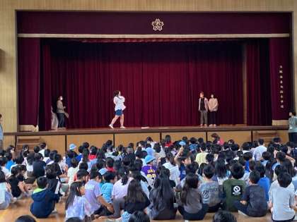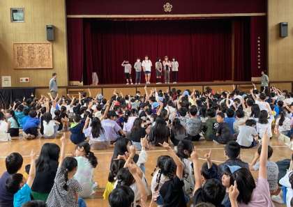 講堂にスマイル班(たてわり班)で集まり、ジェスチャーゲームをしました。集会委員会の児童が舞台上でジェスチャーをして、