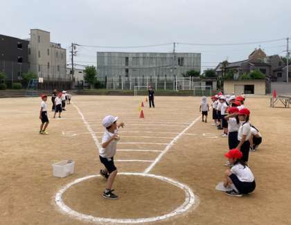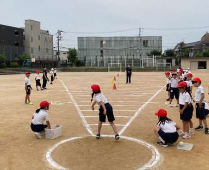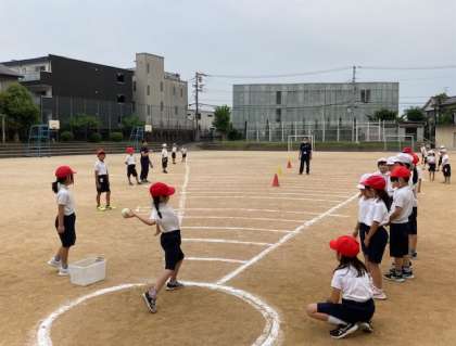 2年生がスポーツテストのソフトボール投げをしました。円のなかでステップをしながら、体を横向きにして斜め45度くらいの方向をめざして投げました。