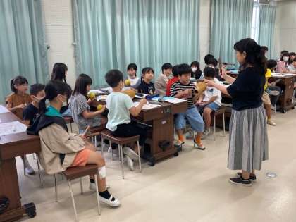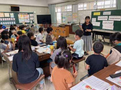 4年生が音楽「拍にのって、歌と打楽器を合わせて演奏しましょう」を学習しました。ギロ、マラカス、クラベスを使って、「いろんな木の実」を歌って、打楽器のリズムのおもしろさを感じ取りながら演奏しました。
