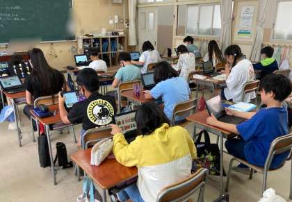 社会科「あたたかい土地のくらし」で学習した沖縄県について、伝統的な文化のまとめをしています。タブレット端末を使って調べたことをノートにまとめました。