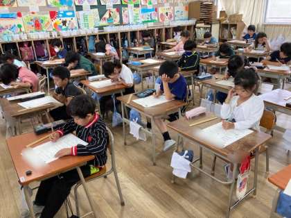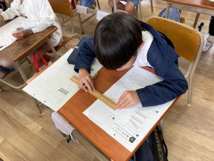 2年生が「長さのたんい」のテストをしました。ものさしを使って問題を解きました。がんばりました2年生。