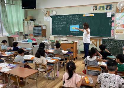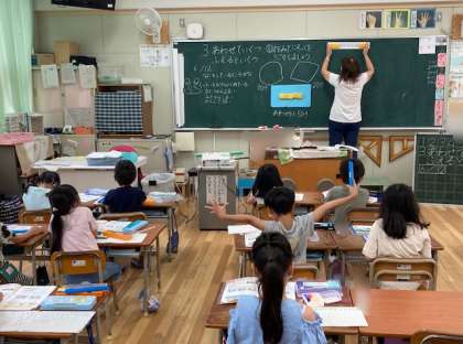 1年生の算数は、「あわせていくつ ふえるといくつ」の学習です。ブロック3つとブロック2つを動かして合わせると5になります。式で表すと3+2=5になります。これをたし算といいます。いよいよたし算の学習が始まりました。