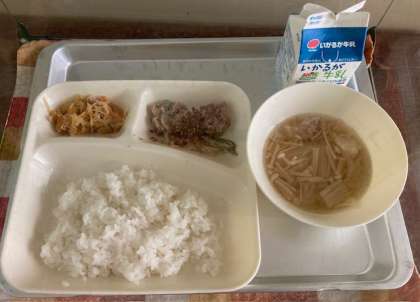 献立は、鶏肉のこまみそ焼き、すまし汁、切干しだいこんのいため煮、ご飯、牛乳です。