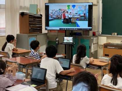今日の児童集会は、図書委員会からの発表をビデオで見ました。図書室の使い方などをクイズ形式で発表しました。