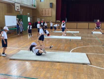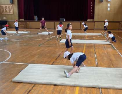 3年生がマット運動「開脚前転」の練習をしました。足を左右に大きく開いて、両手で押して、膝を伸ばしたまま開脚立ちします。足を左右に開くタイミングと膝を伸ばして立ち上がるのが難しいですが、一生懸命に練習しました。