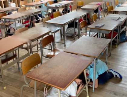 雨で延期していました地震を想定した避難訓練をしました。揺れがおさまるまで机の下にもぐりました。運動場で体育をしている学級は、校舎から離れた場所に集まりました。地震がおさまると、放送の合図で運動場へ避難しました。避難訓練の約束である「お・か・し・も」を守ることができました。押さない、走らない、しゃべらない、戻らないがきちんとできました。