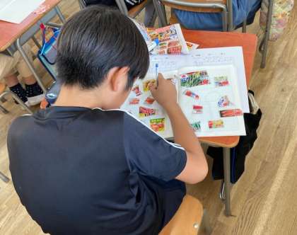 5年生がスーパーのチラシを使って、産地調べをしました。チラシには産地が表示されています。野菜、肉、果物の産地を調べ、切り抜いてノートに貼りました。