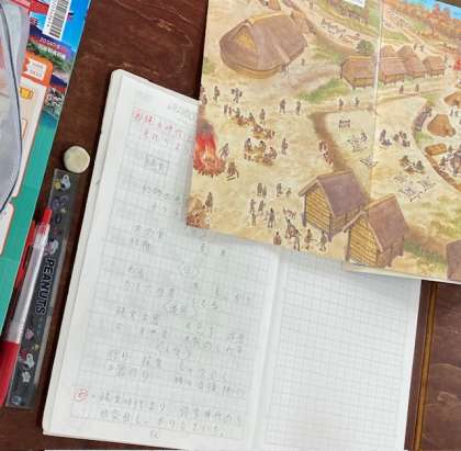 6年生の社会科は、縄文時代と弥生時代のくらしです。資料集を見て、衣、食、住、道具、人々の様子の観点でまとめました。最後はまとめ内容を見てわかったことを書きました。