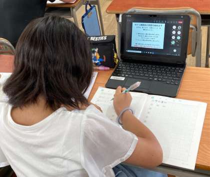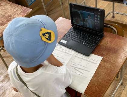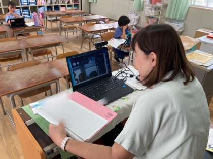 タブレット端末を持ち帰り、学校と家庭をつないだ双方向通信テストを行いました。1年生は国語の音読や絵本の読み聞かせ、2年生は算数プリント、3年生は計算ドリルをしました。家庭で双方向通信ができない児童は、教室で行いました。