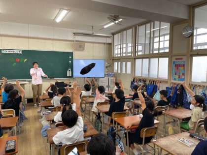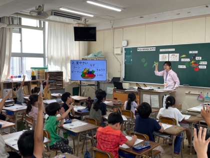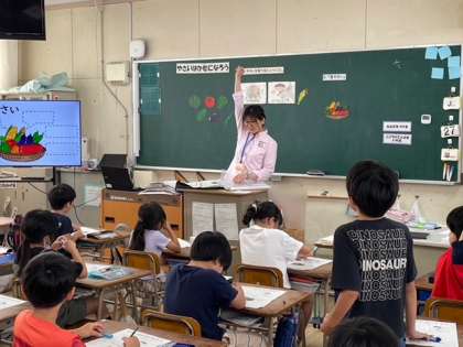 2年生が栄養指導しました。区内の栄養教諭の方に来ていただいて、「やさいはかせになろう」というテーマで、夏野菜のことや野菜を食べるとよいことを学びました。夏野菜のシルエットクイズは楽しかったです。