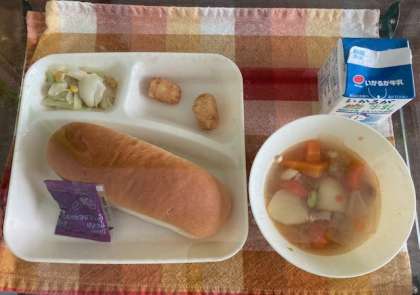 献立は、いかてんぷら、フレッシュトマトのスープ煮、キャベツとコーンのソテー、コッペパン、ブルーベリージャム、牛乳です。