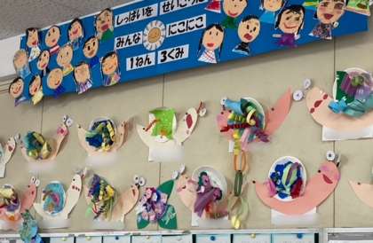 今月は個人懇談会があります。子どもたちの様子をお伝えします。1年生の教室には紙皿と画用紙を使って作ったカタツムリが掲示してあります。季節を感じますね。