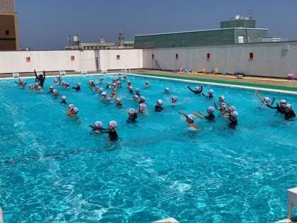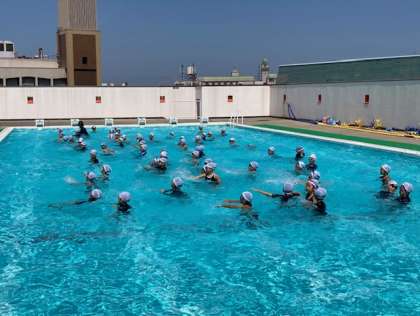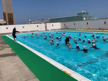 水温が27度なのでプールの水はシャワーより冷たくなく、気持ちよく水泳学習ができました。ディズニーメドレーに合わせて、もぐる、浮く運動などをしました。