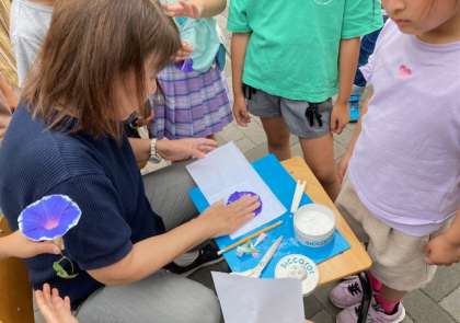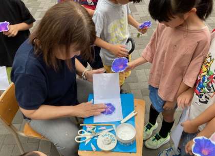 1年生が登校すると、花の広場で先生が机を出して座っています。何かなあと見てみると、あさがおの押し花を作っています。大きく咲いたあさがおを取り、先生に渡して押し花にしてもらいました。
