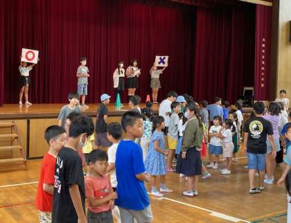 体育館で児童集会をしました。「図書室は3階である。○か??」と、○??クイズをしました。スマイル班の仲間と考えでます○や??のところへ移動しました。児童集会では6年生が1年生を迎えに行ってくれています。6年生、ありがとう。