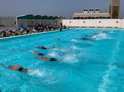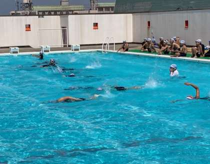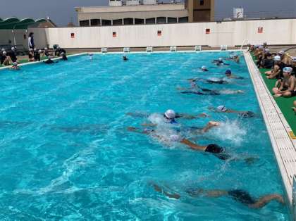4年生の水泳学習の目標は、けのびや呼吸をしながらのばた足泳ぎと、色々なもぐり方や浮き方をすることです。がんばって練習しています。
