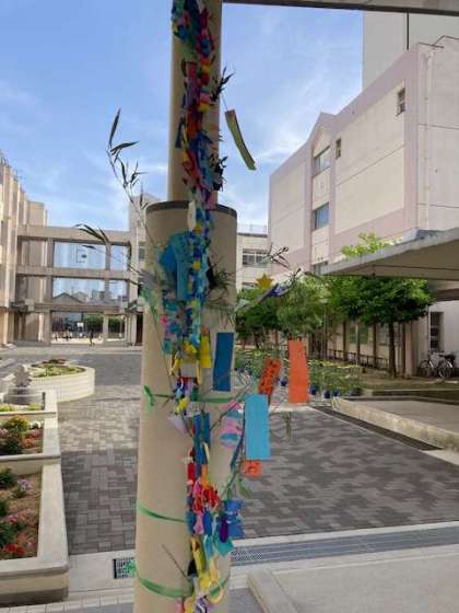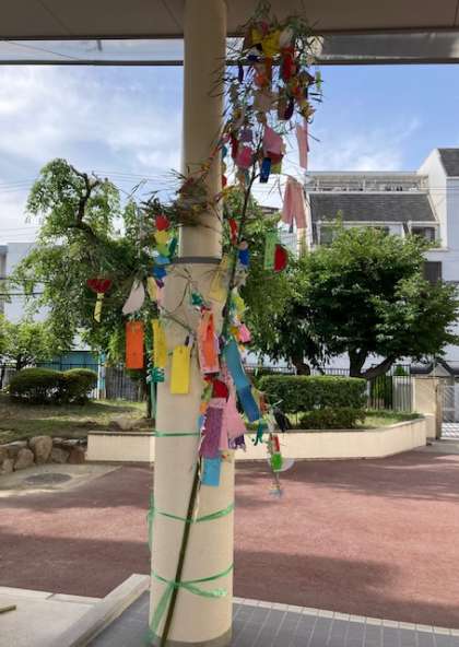 1年生の七夕飾りが完成しました。花の広場に飾られました。明日の七夕が楽しみです。